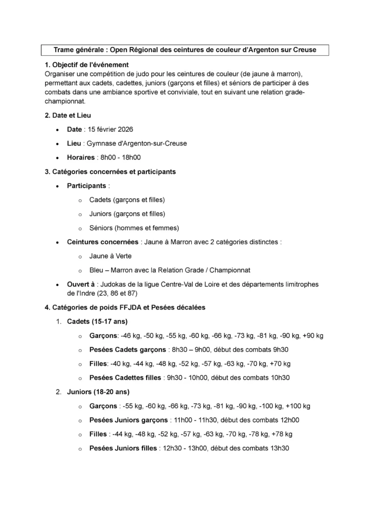 15fev8h0018h00OPEN REGIONAL CEINTURES DE COULEURS ARGENTON SUR CREUSE8h00 - 18h00(GMT+00:00) CENTRE SPORTIF LOTHAIR KUBEL 36200 ARGENTON SUR CREUSE, Avenue de la Font Pie VII